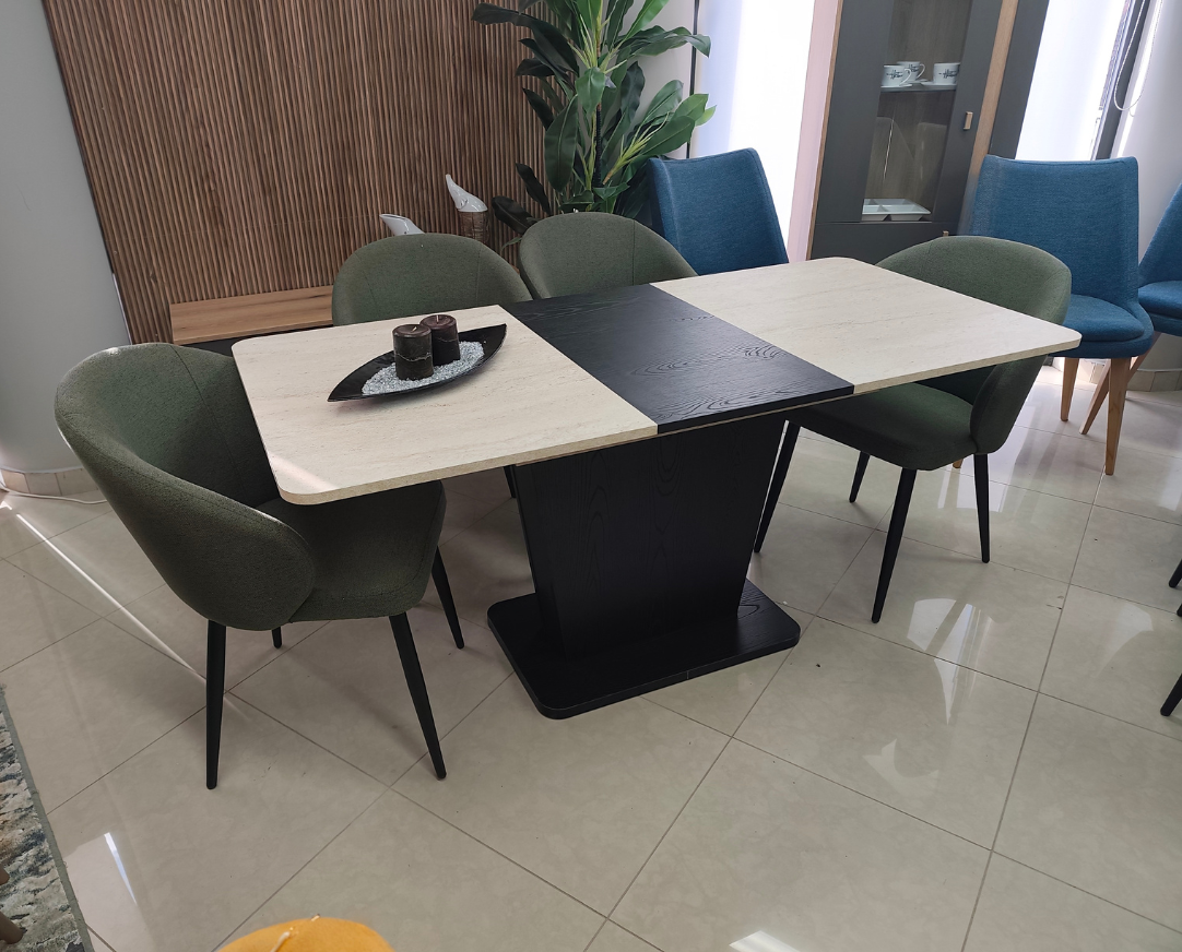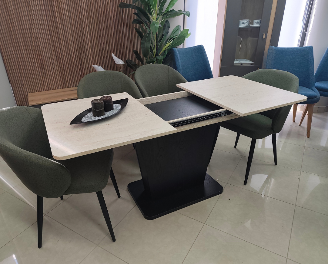 LALI EXT. DINING TABLE IN TRAVERTEN LAMINATE TOP(CREAM COLOR) AND BLACK BASE /DIM. 120+40 X 75 X H76CM