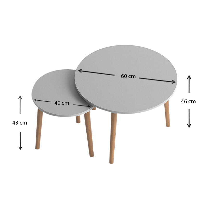 set of 2 round side tables col white  tops and light walnut  massif beech wood feet /diam 60xh46cm/diam 40 x h43cm