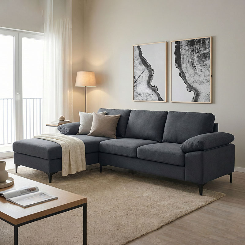 CORNER SUITE OF 2SEATER RIGHT ARM+CHAISE LONG TO THE LEFT IN DARK GREY FABRIC +BLACK METAL FEET -DIM 240 X159 X H83CM-in 2 boxes