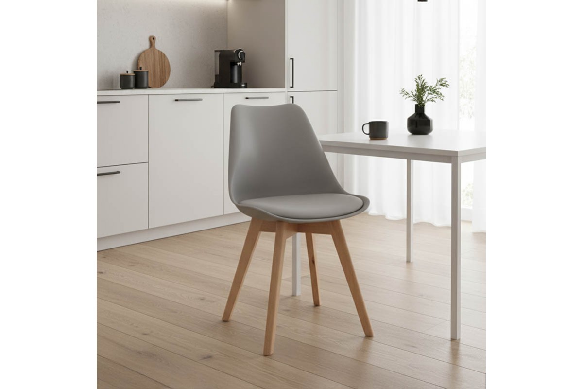 DINING CHAIR IN POLYPROPILINE SEAT LIGHT GREY COLOR WITH L.GREY PU SEAT PILLOW AND NATURAL COLOR WOODEN FEET/DIM. W43 X D51 X H75CM