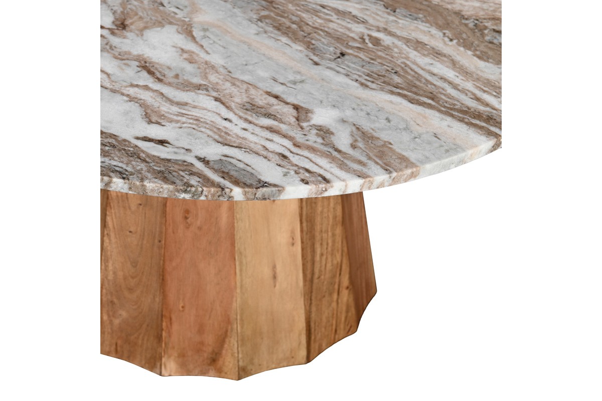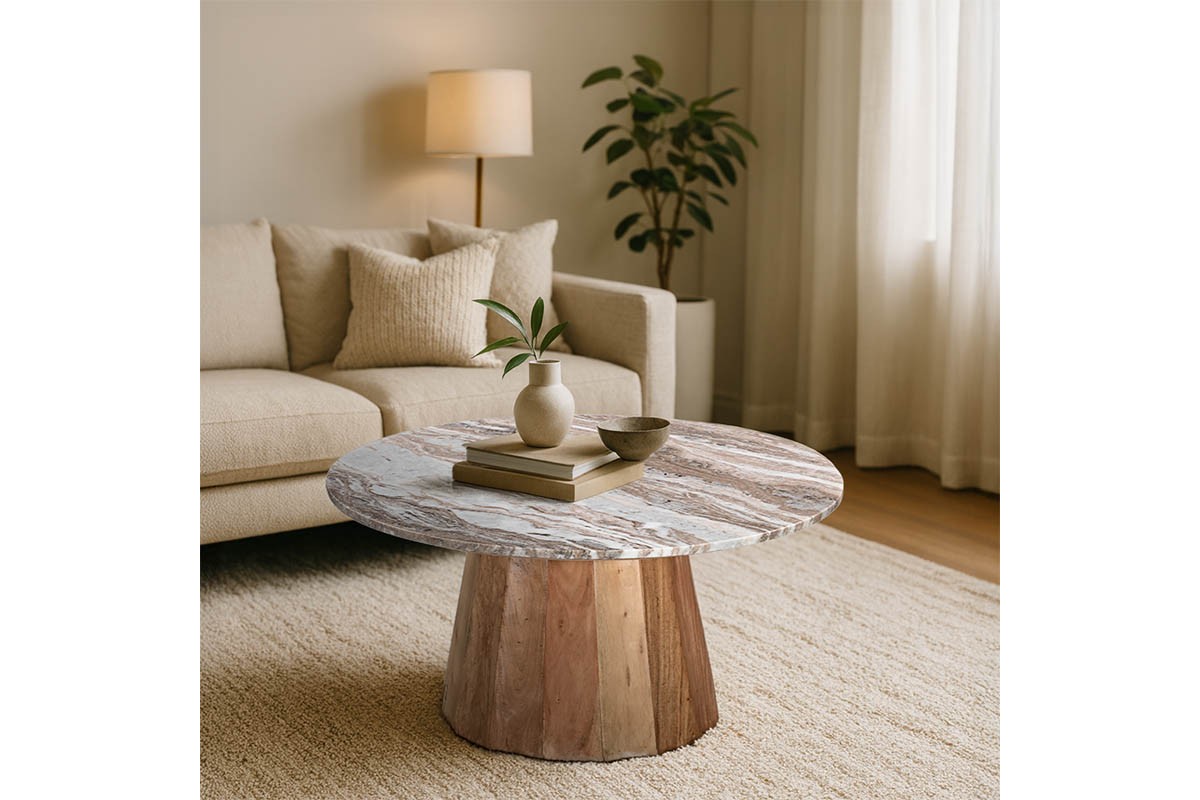 COFFEE TABLE IN SOLID ACACIA WOOD IN NATURAL COLOR AND MARBLE TOP IN BEIGE -BROWN COLORS DIAM : 90 X H45CM