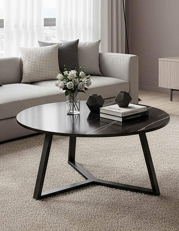 ROUND COFFEE TABLE IN LAMINATE TOP BLACK MARBLE LOOK AND BLACK METAL BASE DIAM : 80 XH40CM