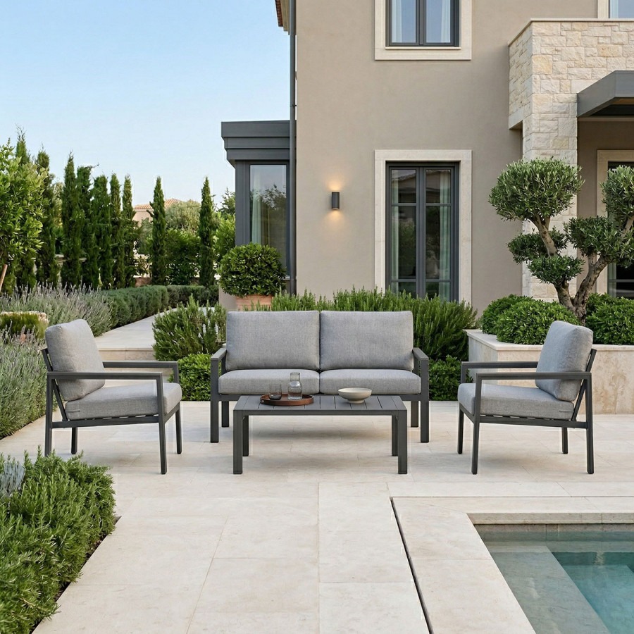 GARDEN SET OF 2+1+1+COFFEE TABLE (WITH POLYWOOD TOP) IN GREY ALUMINUM FRAME /POLYWOOD DETAILS ON ARMRESTS/ SEAT&BACK PILLOWS IN L.GREY FABRIC/