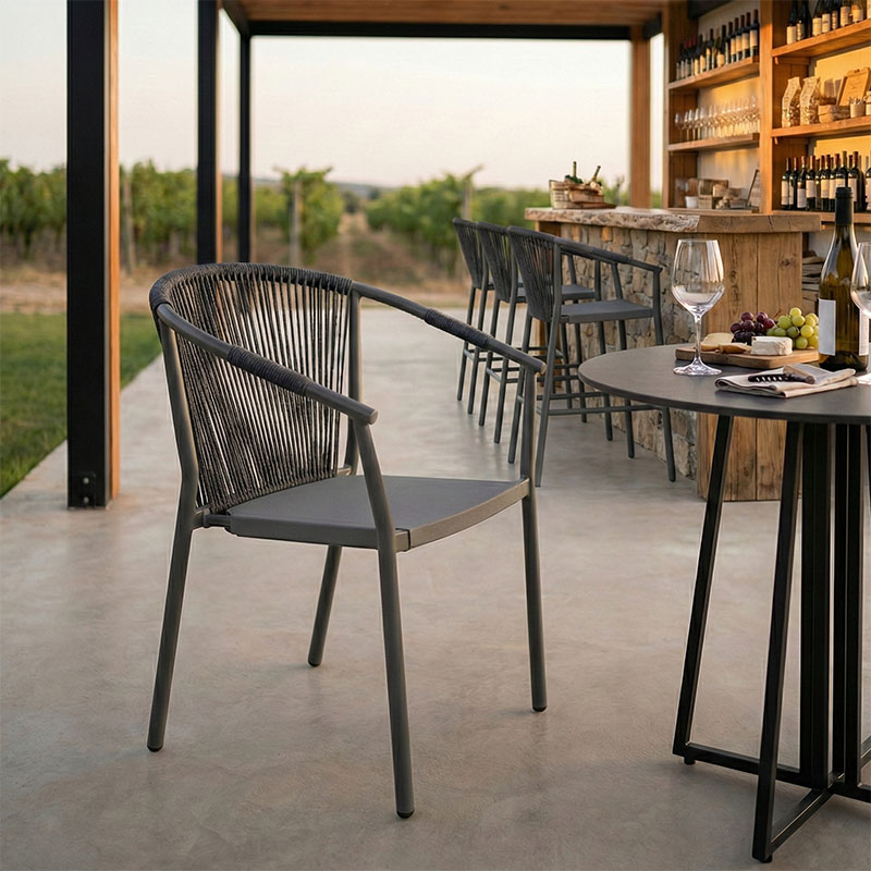 ALUNINUM GARDEN ARMCHAIR STACKABLE IN COL GREY WITH TEXTILENE SEAT AND GREY PE RATTAN DETAILS DIM. W56 X D63 X H82CM